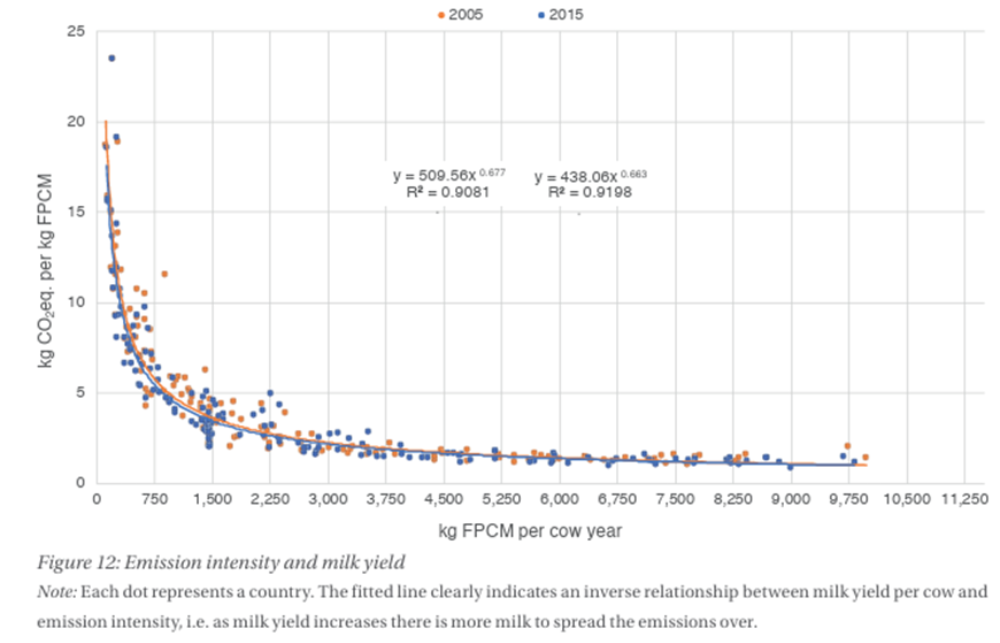 Within these local restraints higher productivity from genetic improvement and associated management is inversely related to GHG emissions intensity, as seen in the FAO graph depicting global milk production by country in 2005 and 2015. The reported change is encouraging with an 11% decline in GHG/kg of milk over this period.